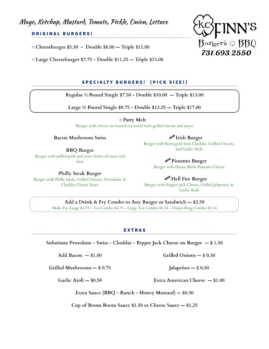 Welcome to KC Finn's, where classic flavors meet modern comfort. Nestled in Jackson, TN, at 1027 S Highland Ave, KC Finn's specializes in a mouthwatering assortment of hot dogs, burgers, and BBQ that keeps locals craving more.